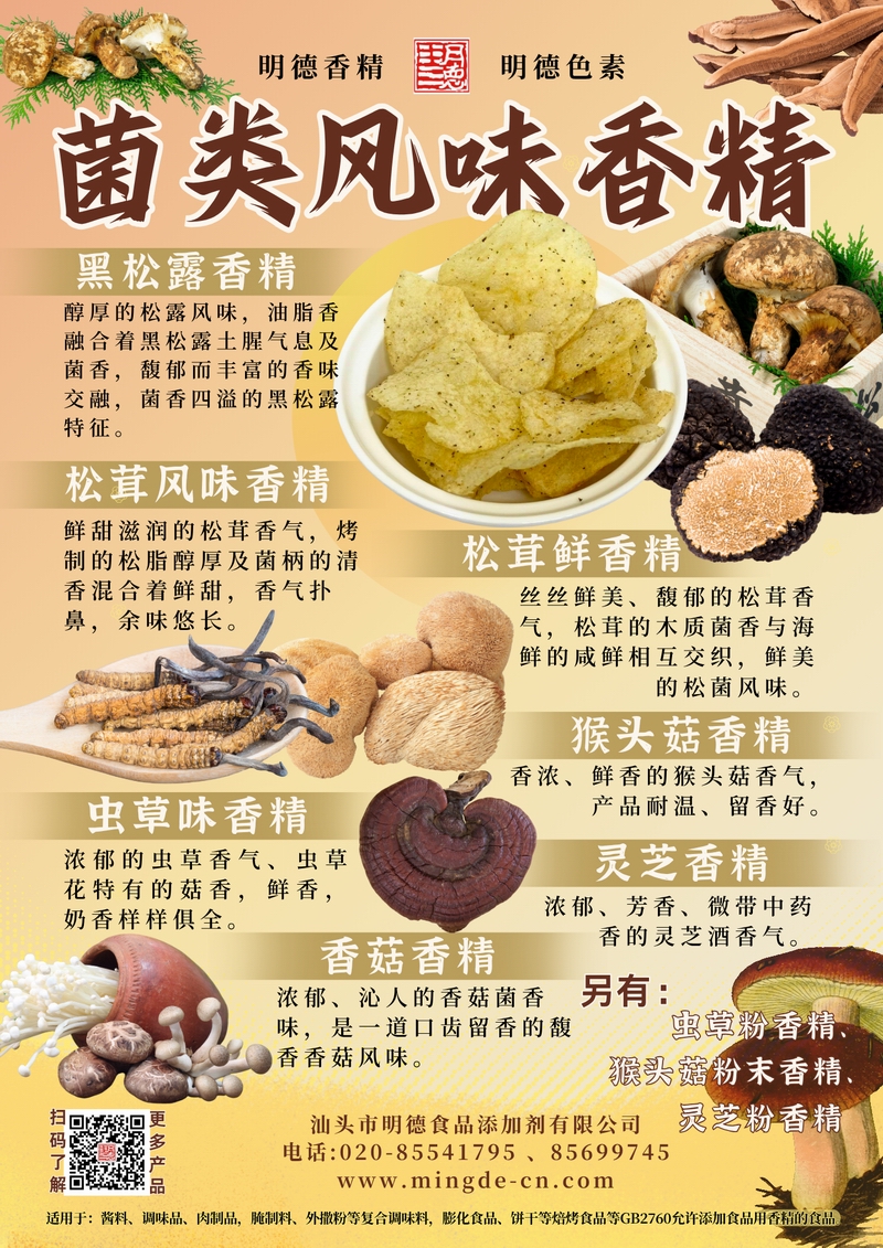汕頭市明德食品添加劑有限公司的菌類風味香精系列,涵蓋黑松露、松茸、蟲草、猴頭菇、靈芝、香菇等多種風味,并配有粉末型產品。產品菌香真實、留香持久、層次豐富,適用于湯料包、醬料、調味品、肉制品、腌制料及外撒粉、復合調味料,膨化食品、餅干等焙烤食品等B端應用,幫助工廠打造具有辨識度的菌類風味產品。