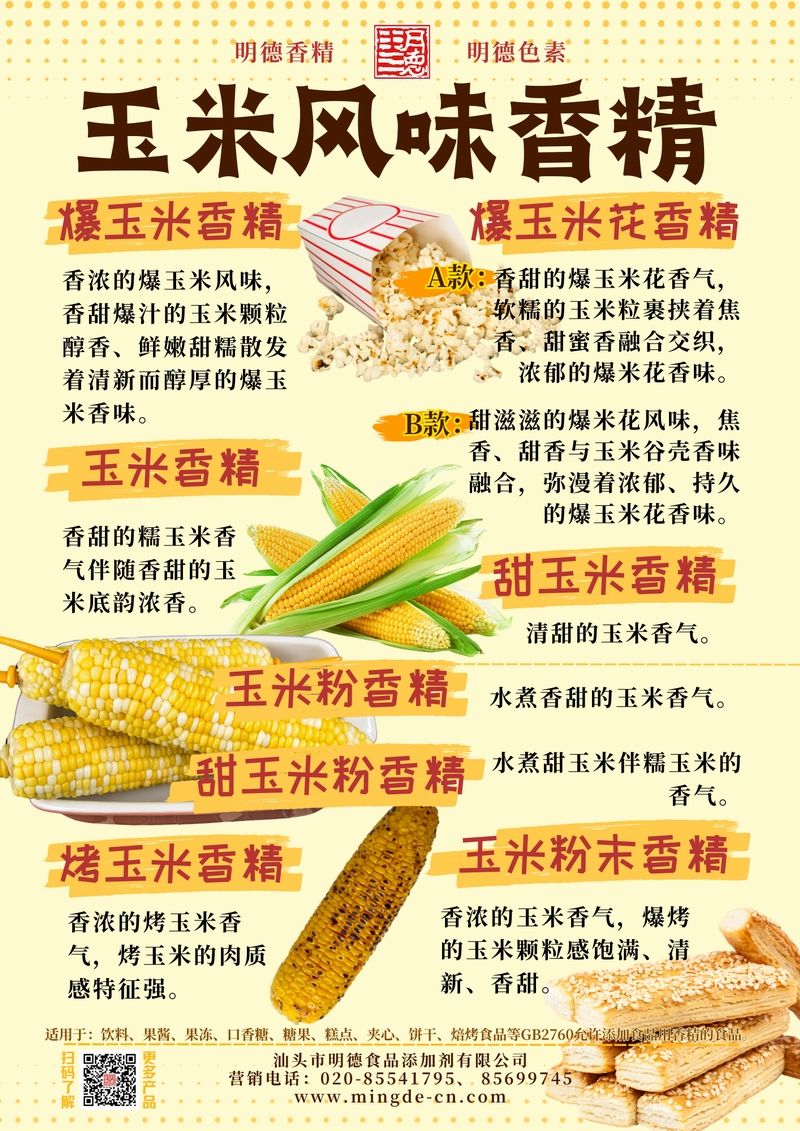 汕頭市明德食品添加劑有限公司推出的玉米風(fēng)味香精系列,覆蓋爆玉米、爆玉米花、烤玉米、糯玉米、甜玉米及粉末型等多種調(diào)性。產(chǎn)品風(fēng)味真實、留香穩(wěn)定,適用于飲品、烘焙、休閑零食、糖果及復(fù)合調(diào)味等B端應(yīng)用,幫助工廠快速打造具有記憶點的玉米風(fēng)味。