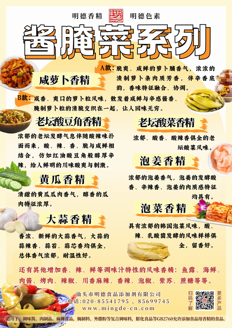 汕頭市明德食品添加劑有限公司的醬腌菜系列香精,涵蓋咸蘿卜、老壇酸豆角、老壇酸菜、黃瓜、泡姜、泡菜、大蒜等多種品類。香氣真實、留香穩(wěn)定,適用于鹵味熟食、腌制菜肴、復(fù)合調(diào)味料、調(diào)味醬、速食及方便食品等B端應(yīng)用,幫助工廠打造具有地道風(fēng)味特征的產(chǎn)品。